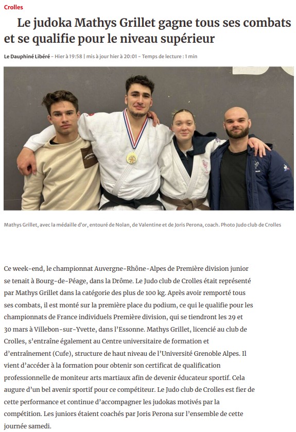 25/02/2025- Crolles. Le judoka Mathys Grillet gagne tous ses combats et se qualifie pour le niveau supérieur